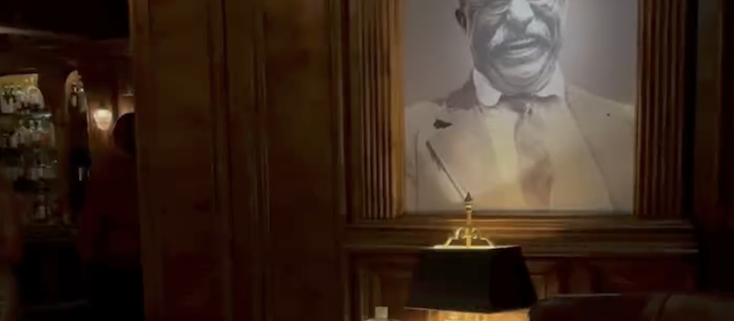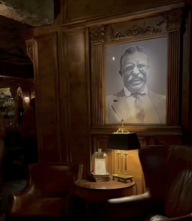 Once inside, the building’s original mail room has been transformed into a richly layered interior. Mailboxes have been reimagined as display niches for vintage books, historic photographs, and a carefully curated collection of spirits. The room is defined by warm woodwork—paneled walls, a hand-carved built-in bar topped with a thick slab of white marble, and hand-carved bookshelves flanking a brick fireplace—all anchored by a portrait of Theodore Roosevelt. Exposed pipes and cement walls introduce a touch of edginess, while modern sofas and cozy nooks soften the historic detailing. An elegant raw bar completes the room, creating an intimate, speakeasy-style setting well-suited for dinner dates, celebrations, and late-night cocktails.